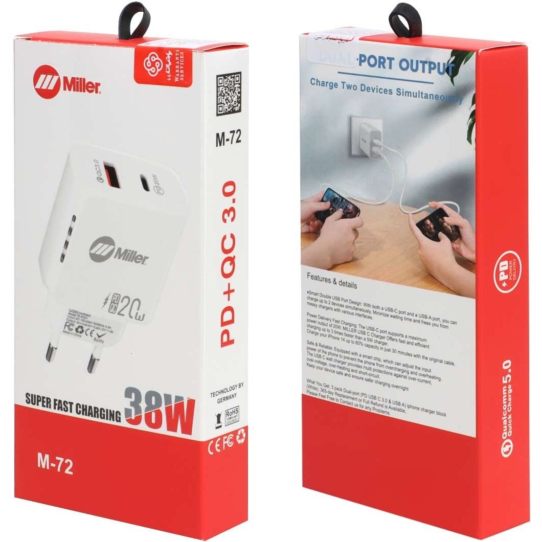شارژر دیواری سوپر فست و PD دو پورت Miller مدل M-72 38W به همراه کابل شارژ Type-C